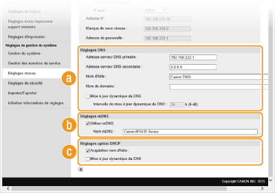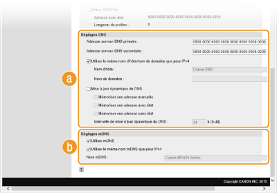 Le service DNS (Domain Name System) assure un service de résolution des noms qui associe un hôte (ou domaine) à une adresse IP. Configurez les réglages DNS, mDNS ou DHCP comme il convient. Notez que les procédures visant à configurer DNS diffèrent selon les adresses IPv4 et IPv6.
