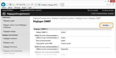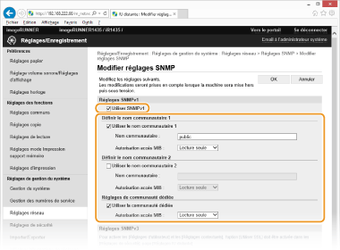 Si les deux versions du protocole SNMP sont activées en même temps, il est recommandé de définir le droit d'accès MIB pour SNMPv1 sur [Lecture seule]. Il est possible de définir différemment les droit d'accès MIB pour les protocoles SNMPv1 et SNMPv3 (ainsi que pour chaque utilisateur dans SNMPv3). Sélectionner [Lecture/Écriture] (tous les droits d'accès) dans SNMPv1 annule les puissantes fonctions de sécurité qui caractérisent SNMPv3, car la plupart des réglages de l'appareil sont alors contrôlés par SNMPv1.