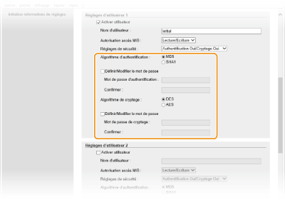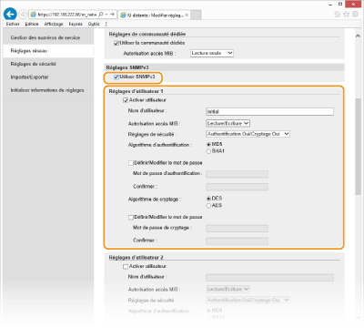 Cochez la case [Activer utilisateur] et définissez les réglages [Nom d'utilisateur], [Autorisation accès MIB] et [Réglages de sécurité].