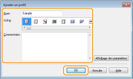 En cliquant sur [Edition] qui se trouve à droite de [Ajouter] dans l'écran illustré à l'étape 1, il est possible de modifier le nom, l'icône ou les commentaires des profils que vous avez déjà enregistrés. Vous ne pouvez pas modifier les profils pré-enregistrés.