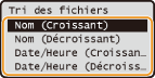 Vous définissez le réglage tel que <Nom (Croissant)> ou <Date/Heure (Croissant)> comme valeur par défaut permettant de trier les fichiers.