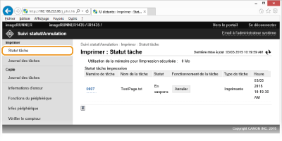 Cliquez sur [Numéro de tâche] pour les documents dont l'impression est suspendue afin d'afficher les informations détaillées telles que le nom de l'utilisateur et le nombre de pages du document.