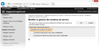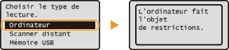Si la case [Lecture] est cochée, la numérisation des documents sur des périphériques mémoire USB, dans des e-mails et sur des serveurs de fichiers est impossible. Vous pouvez également désactiver la numérisation de documents sur des ordinateurs via les options <Ordinateur> et <Scanner distant>. Notez toutefois que vous ne pouvez désactiver la numérisation des documents sur les ordinateurs que pour l'ensemble des numéros de service (Blocage de tâches en cas d'ID de service inconnu).