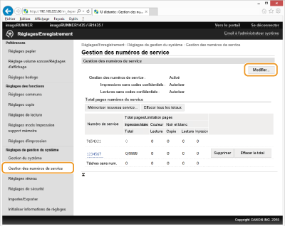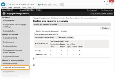 [Total pages numéros de service]Vous pouvez vérifier le nombre total de pages copiées, imprimées ou tnumérisées pour chaque ID de service.