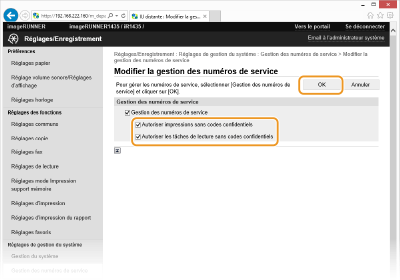 Cochez la case pour afficher l'écran [Confirmer l'ID de service/PIN] chaque fois que vous lancez une impression à partir d'un ordinateur. [Authentifier l'ID de service/le PIN du périphérique]