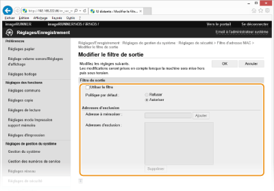 Cochez la case [Utiliser le filtre] et cliquez sur la case d'option [Refuser] ou [Autoriser] correspondant à [Politique par défaut :].