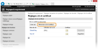 [Réglages clé et certificat] (pour les paires de clés) ou sur [Réglages certificat CA] (pour les certificats CA).