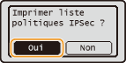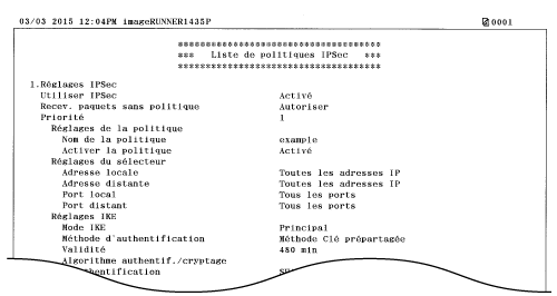 Vous imprimez la liste pour examiner le nom des polices et les réglages IPSec couramment enregistrés dans l'appareil.