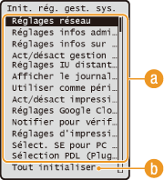 Liste des menus des réglages). Certains réglages nécessitant que vous redémarriez l'appareil pour finaliser l'initialisation.