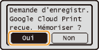 Vous pouvez également enregistrer l'appareil depuis un terminal mobile ou Google Chrome*. L'écran de l'appareil affiche le message de confirmation ci-après avant la fin de l'enregistrement. Appuyez sur <Oui> pour terminer l'enregistrement.