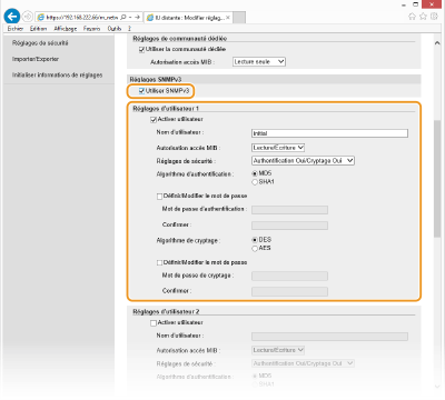 Cochez la case [Activer utilisateur] et définissez les réglages [Nom d'utilisateur], [Autorisation accès MIB] et [Réglages de sécurité].