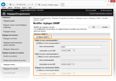 Si les deux versions du protocole SNMP sont activées en même temps, il est recommandé de définir le droit d'accès MIB pour SNMPv1 sur [Lecture seule]. Il est possible de définir différemment les droit d'accès MIB pour les protocoles SNMPv1 et SNMPv3 (ainsi que pour chaque utilisateur dans SNMPv3). Sélectionner [Lecture/Écriture] (tous les droits d'accès) dans SNMPv1 annule les puissantes fonctions de sécurité qui caractérisent SNMPv3, car la plupart des réglages de l'appareil sont alors contrôlés par SNMPv1.