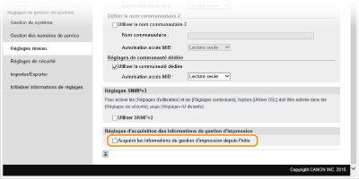 Quand vous n'utilisez pas SNMPv1Si les deux versions de SNMP sont désactivées, certaines fonctions de l'appareil ne seront pas disponibles. Ainsi, vous ne pourrez pas obtenir d'informations sur l'appareil par le biais du pilote d'imprimante.
