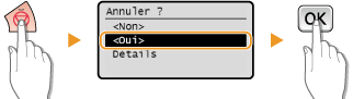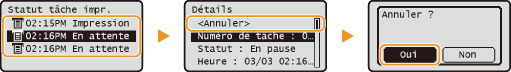 Annulation à partir de l'interface utilisateur distanteVous pouvez annuler l'impression dans la page [Statut tâche] de l'interface utilisateur distante : Vérification de l'état actuel des documents d'impression