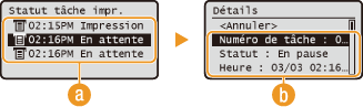.![]() <Statut tâche impr.>Affiche la liste des documents en cours de traitement, de copie ou en attente de traitement.
