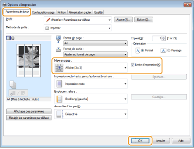 Cochez la case [Limite d'impression] pour insérer les limites dans vos impressions. Les limites sont utiles si vous voulez coller des impressions ensembles ou supprimer les marges.