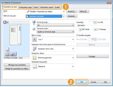 Cliquez sur les onglets [Paramètres de base], [Configuration page], [Finition], [Alimentation papier] ou [Qualité] pour choisir les réglages d'impression figurant sur chaque écran.