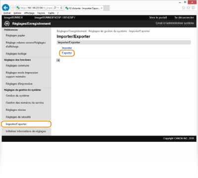 Pendant l'exportation, l'écran reste inchangé ou le message indiquant que ce processus est en cours s'affiche. N'utilisez pas l'interface utilisateur distante avant que le message vous invitant à enregistrer le fichier exporté s'affiche.