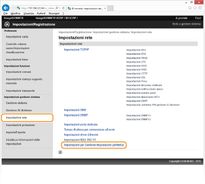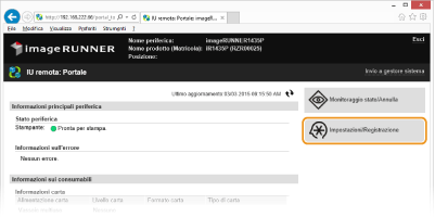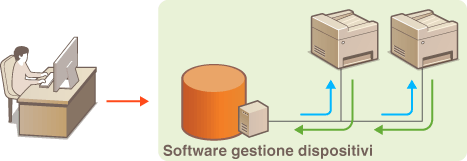 È possibile facilitare la raccolta e la gestione di varie informazioni sui dispositivi di rete implementando un software di gestione dei dispositivi, ad esempio iW Management Console*, sulla rete. Informazioni come impostazioni di dispositivo e registri di errore vengono recuperati e distribuiti attraverso il server. Se la macchina è collegata a questo tipo di rete, il software di gestione dispositivi cerca la macchina nella rete utilizzando protocolli come Service Location Protocol (SLP) per raccogliere informazioni dalla macchina. In questa sezione vengono descritte le procedure delle impostazioni SLP e delle impostazioni per la comunicazione tra la macchina e i plug-in di iW Management Console. Queste impostazioni SLP possono essere specificate attraverso la IU remota.