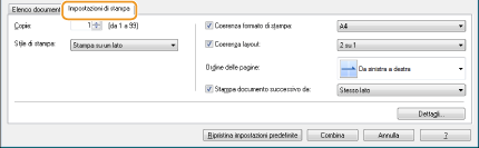Fare clic sulla scheda [Impostazioni di stampa] per visualizzare la schermata in cui specificare le impostazioni di stampa come numero di copie o stampa su di un lato/fronte-retro. Le impostazioni specificate qui vengono applicate all'intero lavoro di stampa.