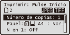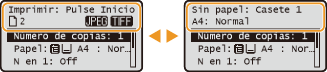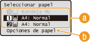 (Selección de papel/Opciones) para seleccionar el papel que desea utilizar en la pantalla <Seleccionar papel>. Asimismo, puede pulsar esta tecla para cambiar la configuración del papel cuando cargue un tipo o tamaño de papel diferente al tipo o tamaño de papel cargado anteriormente. Tenga en cuenta que la configuración del papel debe especificarse correctamente para que el papel se introduzca sin problemas.
