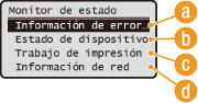 Muestra el estado del equipo, como la cantidad de papel o tóner restante.