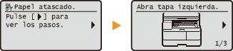 En algunos casos, cuando se produce un error, aparecen las instrucciones sobre cómo responder ante dicho error. Siga las instrucciones de la pantalla para solucionar el problema. La pantalla que aparece cuando se produce un atasco de papel se muestra a continuación a modo de ejemplo (