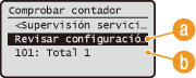 (Comprobar contador), aparecerá la pantalla <Comprobar contador>. En este pantalla puede ver el valor del contador, así como el número de serie del equipo y la configuración del mismo.