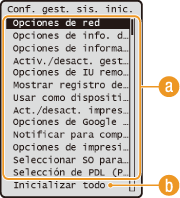 Lista del menú de configuración). En el caso de algunas opciones, deberá reiniciar el equipo para completar la inicialización.