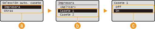 Seleccione <On> para habilitar la selección de casete de forma automática del origen del papel seleccionado en la pantalla anterior (