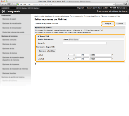 Puede registrar la información, incluido el nombre del equipo y la ubicación de instalación, que se utilice para identificar el equipo. Asimismo, puede deshabilitar la función AirPrint del equipo. Utilice la IU remota para cambiar estas opciones.