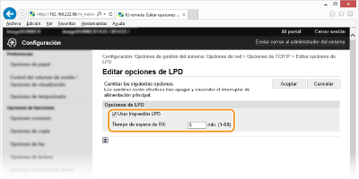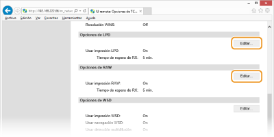 Seleccione la casilla de verificación para imprimir a través de LPD. Cuando no utilice la impresión LPD, desmarque la casilla de verificación. [Usar impresión RAW]