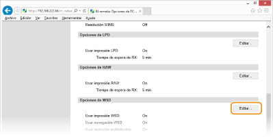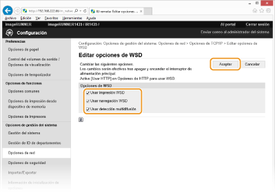 Seleccione la casilla de verificación para imprimir a través de WSD. Cuando no utilice la impresión WSD, desmarque la casilla de verificación. [Usar navegación WSD]