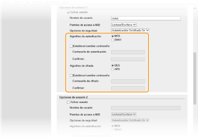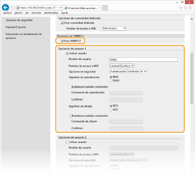 Seleccione la casilla de verificación [Activar usuario] y especifique las opciones [Nombre de usuario], [Permiso de acceso a MIB] y [Opciones de seguridad].