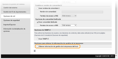 Seleccione la casilla de verificación [Usar comunidad dedicada] y especifique la opción [Permiso de acceso a MIB].