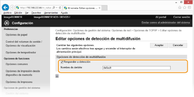 Marque la casilla de verificación para que el equipo responda a los paquetes de detección multidifusión del software de gestión de dispositivos y habilite la supervisión a través del software de gestión de dispositivos. [Nombre de ámbito:]
