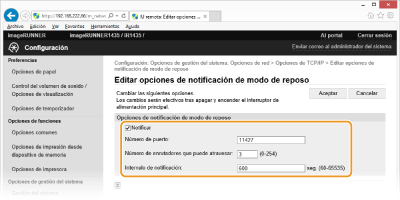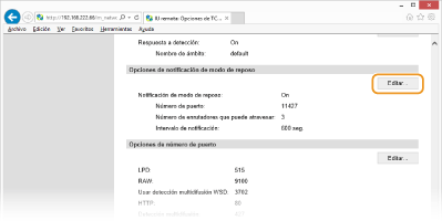 Seleccione la casilla de verificación para informar al software de gestión de dispositivos del estado de energía del equipo. Si se selecciona [Notificar], el equipo evitará las comunicaciones innecesarias durante el modo de inactividad y reducirá el consumo total de energía. [Número de puerto:]