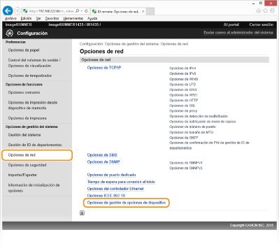 Puede facilitar la recopilación y la gestión de información sobre los dispositivos de red implementando en la red software de gestión de dispositivos, como por ejemplo iW Management Console*. La información, como las opciones de los dispositivos y los registros de errores, se recupera y se distribuye a través del ordenador servidor. Si el equipo está conectado a dicha red, el software de gestión de dispositivos busca la red del equipo utilizando protocolos tales como el Protocolo de ubicación de servicios (SLP) para recopilar información del equipo. Esta sección describe los procedimientos de las opciones de SLP y las opciones para la comunicación entre el equipo y los complementos de iW Management Console. Estas opciones pueden especificarse a través de la IU remota.