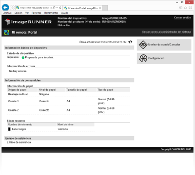 Para utilizar el equipo de forma remota, debe introducir la dirección IP del equipo en un navegador web e iniciar la IU remota. Compruebe la dirección IP establecida en el equipo previamente (