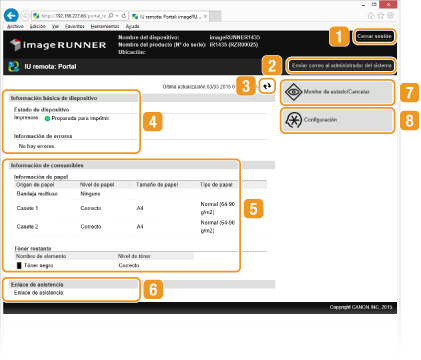 Muestra el estado actual del equipo y la información de error. Si se ha producido un error, aparecerá el vínculo a la página [Información de errores].