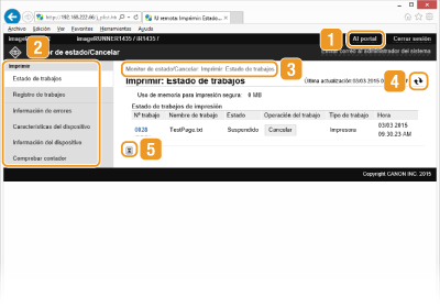 Muestra el estado de los documentos de impresión actuales y el historial de impresiones. Asimismo, puede consultar el estado del equipo.