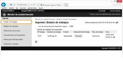 Haga clic en [Nº trabajo] en los documentos pausados para mostrar información detallada como el nombre de usuario y el número de páginas del documento.