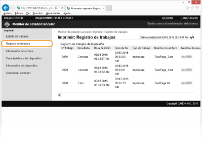Cuando haya habilitado Administración de ID de departamento, aparecerán todos los documentos de impresión actualmente procesados, independientemente del ID de departamento en el que inició sesión.