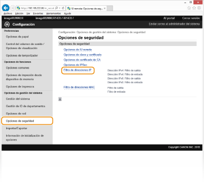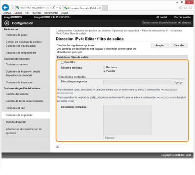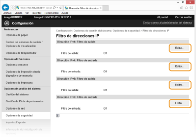 Comprobación de los errores de entrada Si las direcciones IP se introducen de forma incorrecta, es posible que no pueda acceder al equipo desde la IU remota, en cuyo caso deberá establecer <Filtro de direcciones IPv4> o <Filtro de direcciones IPv6> en <Off>. Filtro de direcciones IPv4 Filtro de direcciones IPv6