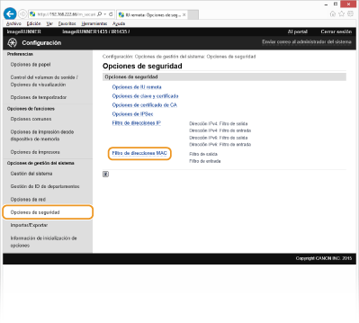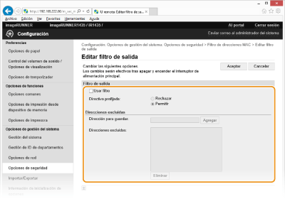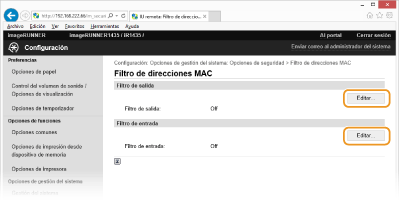 Comprobación de los errores de entrada Si las direcciones MAC se introducen de forma incorrecta, es posible que no pueda acceder al equipo desde la IU remota, en cuyo caso deberá establecer <Filtro de direcciones MAC> en <Off>. Filtro de direcciones MAC