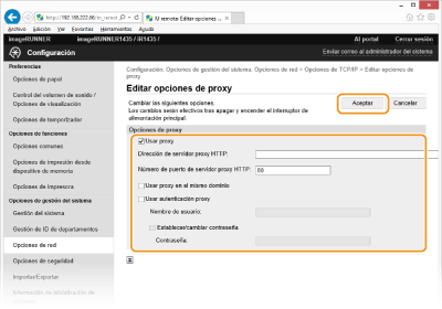 Seleccione la casilla de verificación [Usar proxy] y especifique las opciones necesarias.