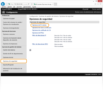 Haga clic en [Opciones de seguridad]  [Opciones de IU remota].