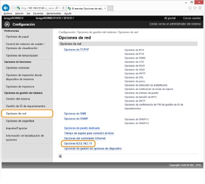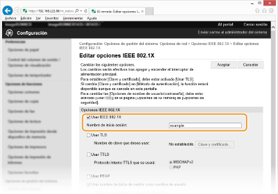 Seleccione la casilla de verificación [Usar IEEE 802.1X], introduzca el nombre de inicio de sesión en el cuadro de texto [Nombre de inicio sesión:] y especifique las opciones necesarias.