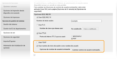 Las opciones necesarias son casi las mismas que las de TTLS. MSCHAPv2 se utiliza como protocolo interno. Habilite TLS para la IU remota antes de configurar este método de autenticación (