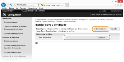 Los pares de claves y los certificados digitales pueden obtenerse con la ayuda de una entidad de certificación (CA) y utilizarse con el equipo. Puede guardar y registrar estos archivos utilizando la IU remota. Asegúrese de que el par de claves y el certificado cumplan los requisitos del equipo (